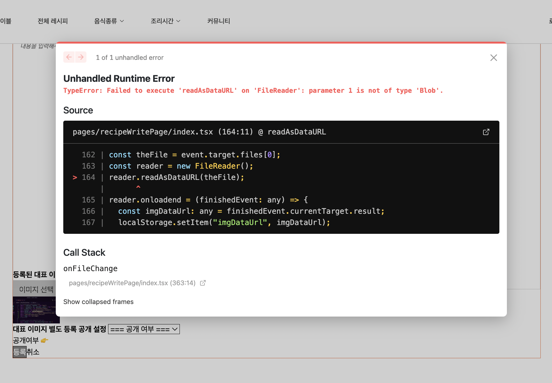 처음 대표 이미지를 업로드 하고나서, 마음이 바껴 다른 사진을 업로드 하려다가 "취소" 버튼을 누르면 아래와 같은 에러메세지가 뜨는 현상이 발생했다.