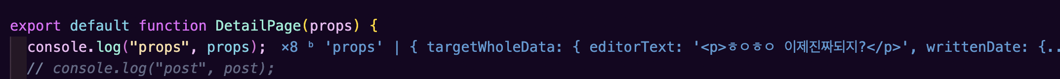 이렇게 props로 잘 넘어와있는 데이터들을 확인할 수 있다 ㅇ_<